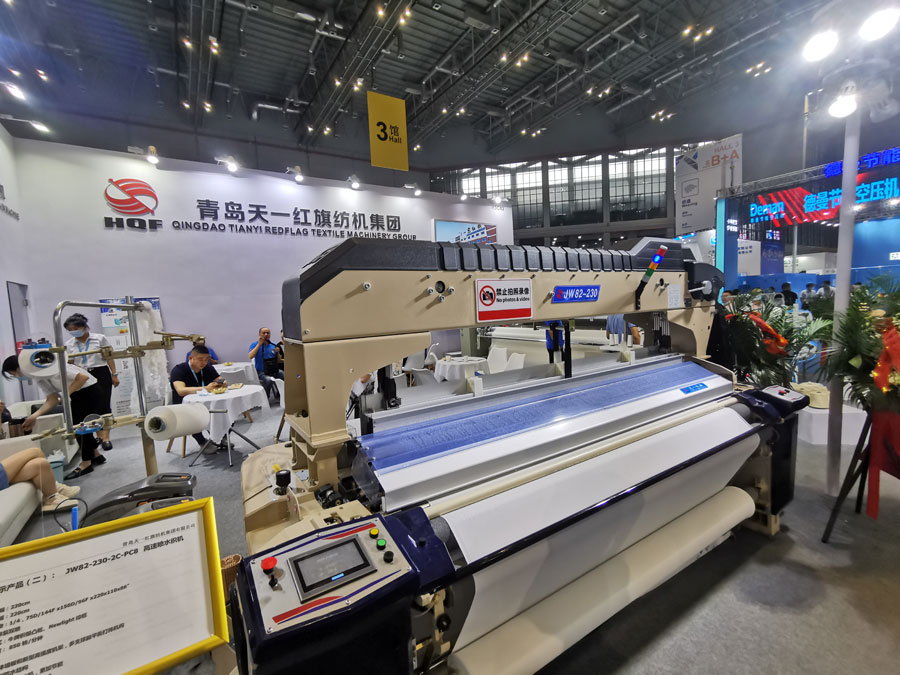 天一紅旗在2020紡機聯(lián)合展上展出了JA92-400高速寬幅噴氣織機和JW82-230高速噴水織機。