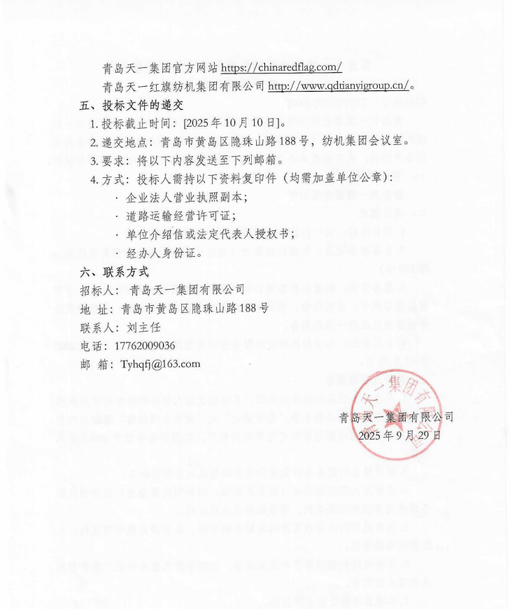 青島天一集團(tuán)關(guān)于紡機(jī)集團(tuán)公司物流運(yùn)輸業(yè)務(wù)公開招標(biāo)公告
